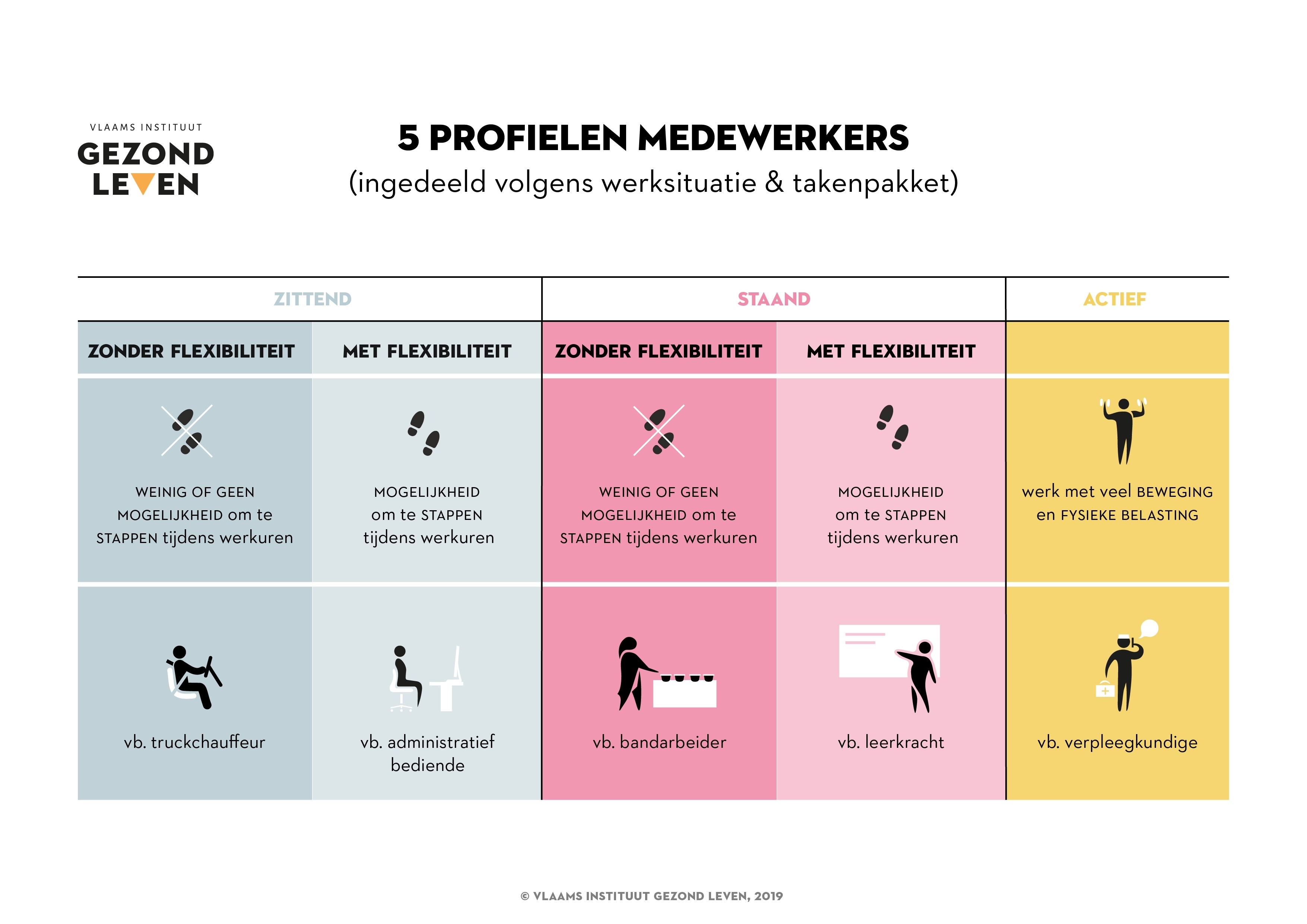Zo zal personeel met zittend werk en flexibiliteit eerder aangezet kunnen worden om meer te bewegen op het werk. Personeel met staand werk zonder flexibiliteit daarentegen kunnen gemotiveerd worden om meer te stappen van en naar het werk, in de vrije tijd én in de thuisomgeving. Personeel met fysiek actief werk kunnen dan weer ontspanning halen uit bewegen in de vrije tijd (bv. wandelen met gezin, in de natuur …).